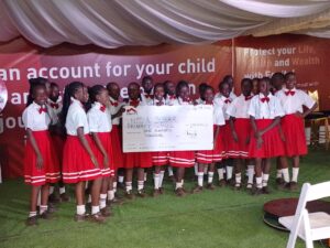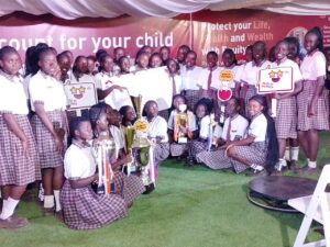 Students of Nzoia Sugar Company Primary and JSS celebrate cash prize during a national festival. PHOTO/FILE